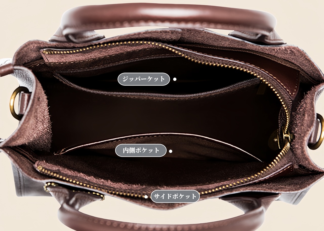 大容量の内部収納スペースで、携帯電話、書類、本、手帳、折りたたみ傘など、様々な個人アイテムをスムーズに入れることができ、とても実用的です。