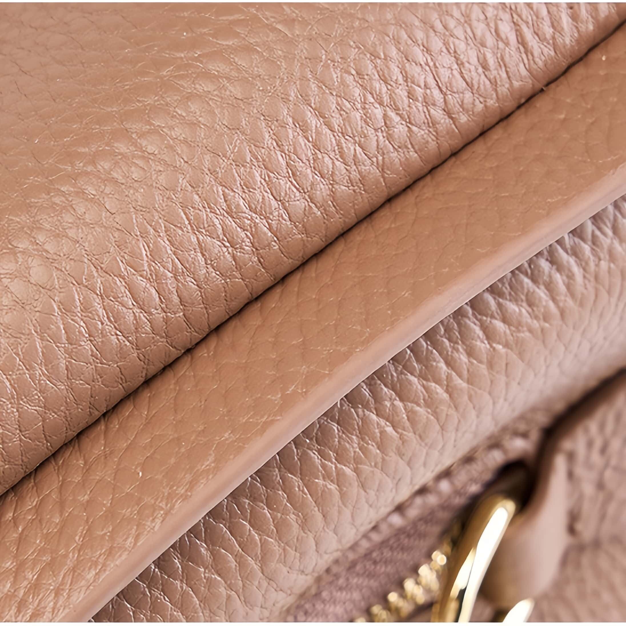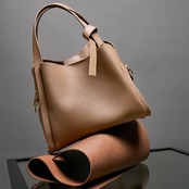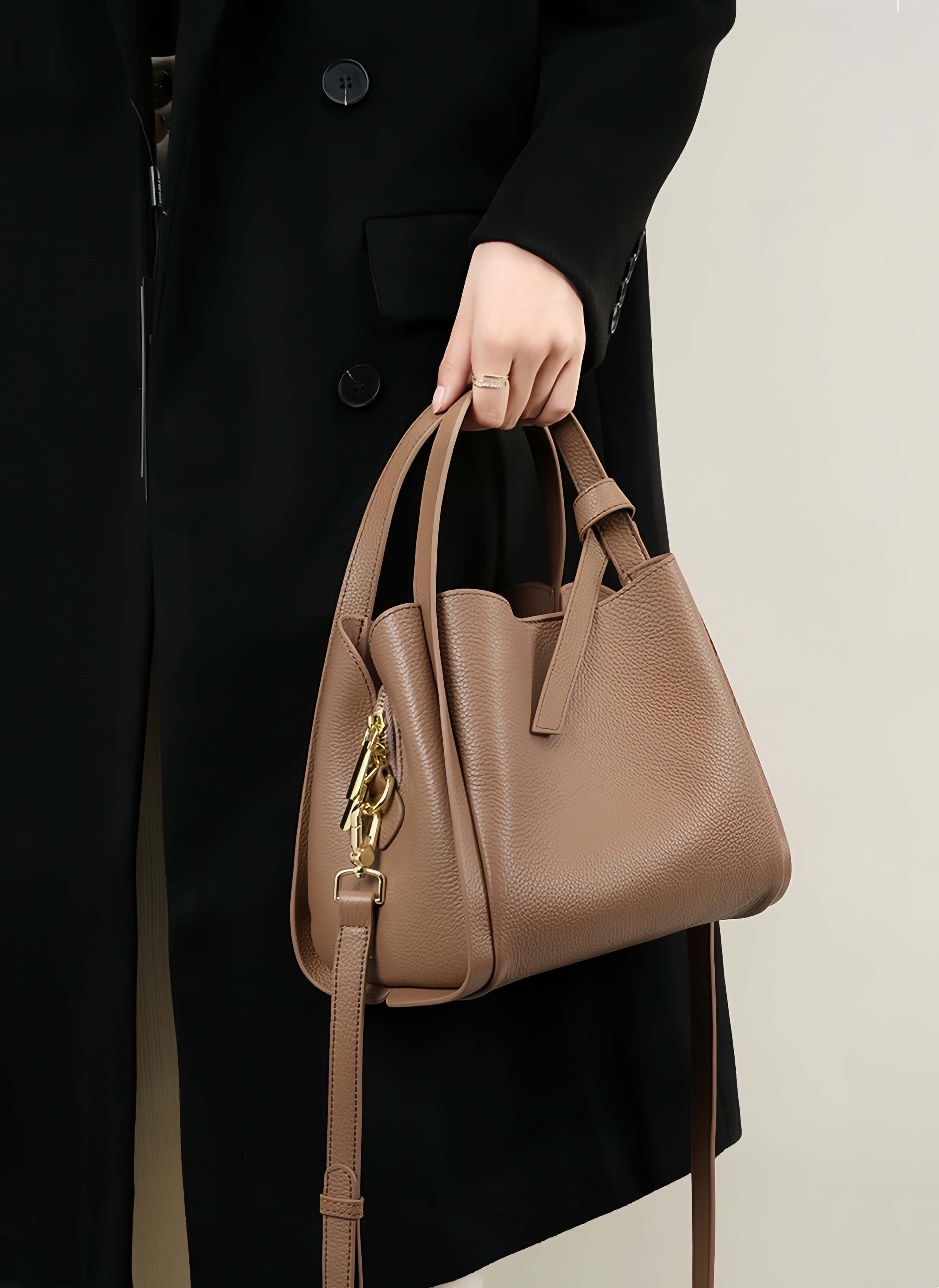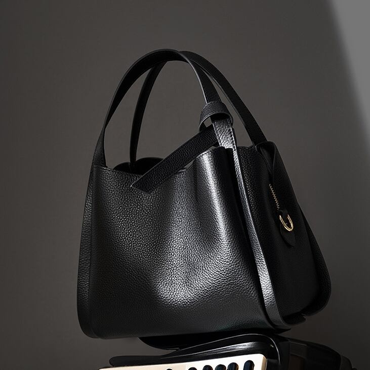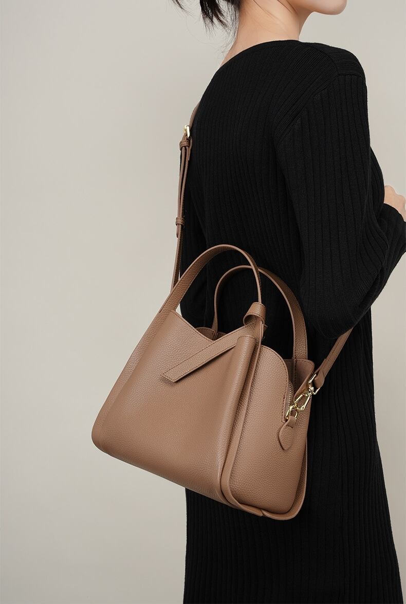 この天然牛革の手提げバッグは、柔らかさと深い質感で印象的です。
