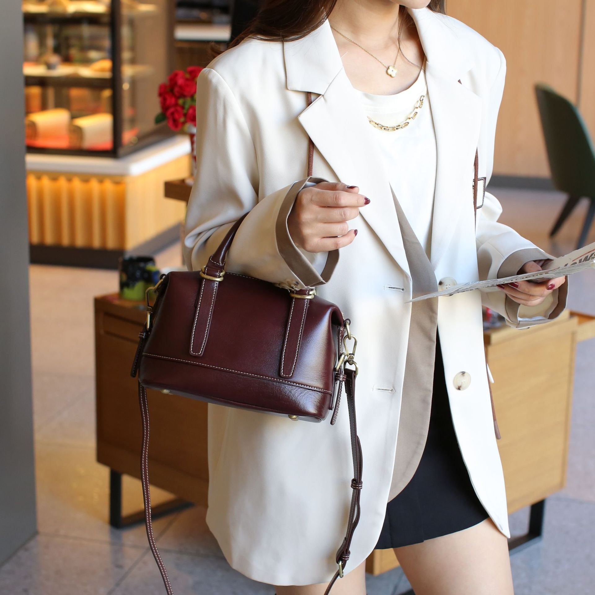 内部には、合理的な収納スペースが巧みに設計されており、携帯電話、ウォレット、折りたたみ傘、リップクリーム、メガネなどの日常の個人アイテムを、整理整頓しながらスムーズに収納することができます。