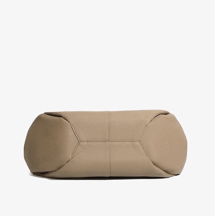 このバッグは、波打つようなラインと丸みのある折りたたみデザインが特徴です。