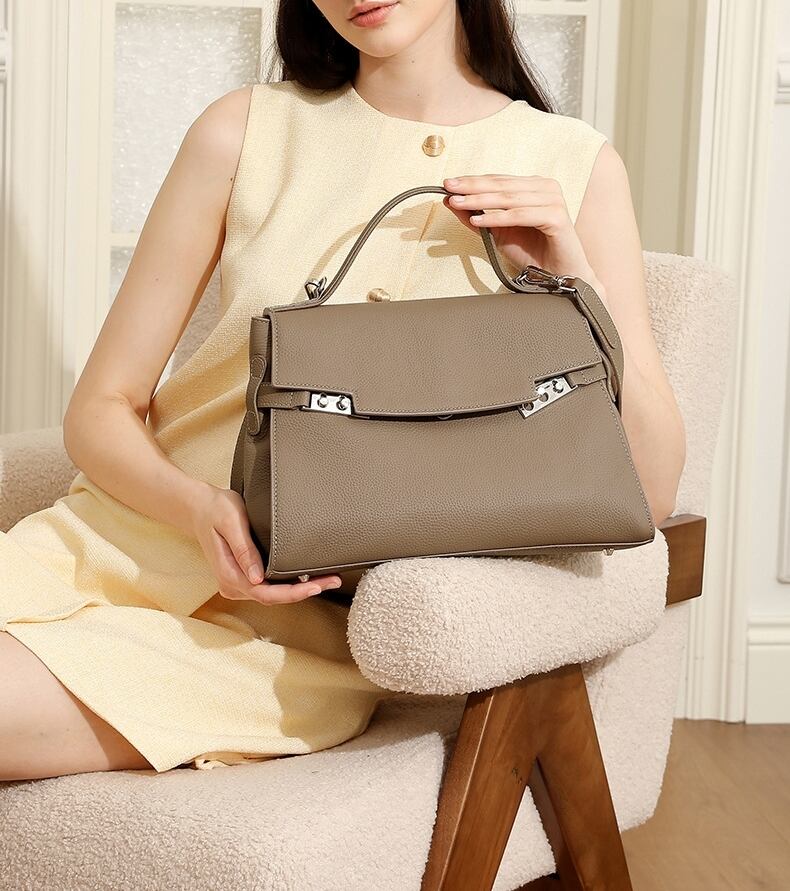 方正な梯形の輪郭と、柔らかな曲線を描くフラップが、洗練された美しさを演出します。