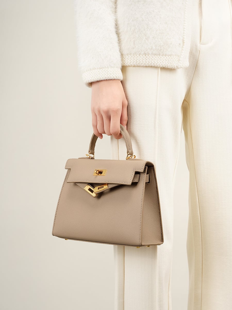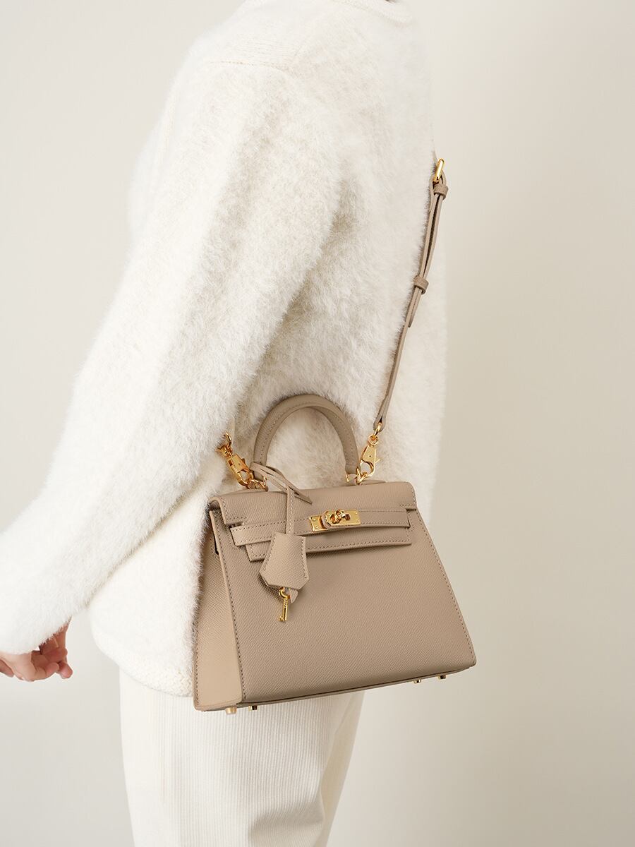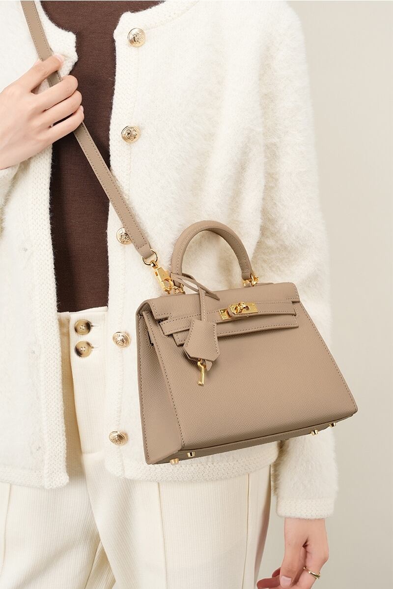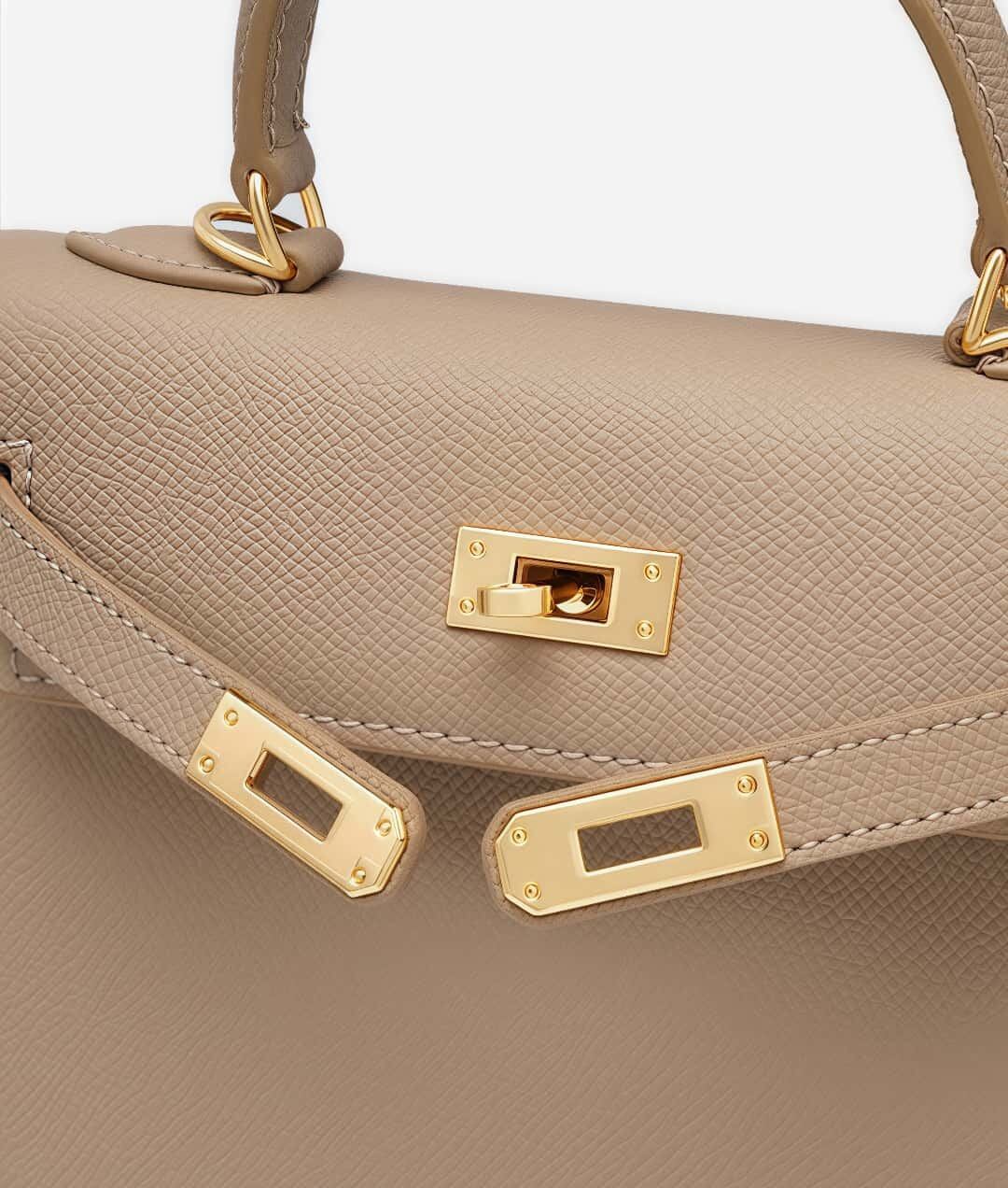 両サイドには装飾的なベルトとゴールドの金具があしらわれており、エレガントな印象を強調します。フロントにはレザー製のネームタグ風チャームがアクセントとして垂れ下がっています。