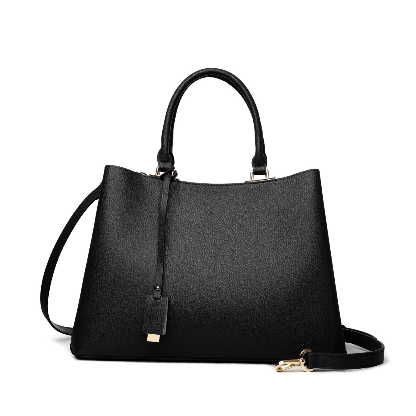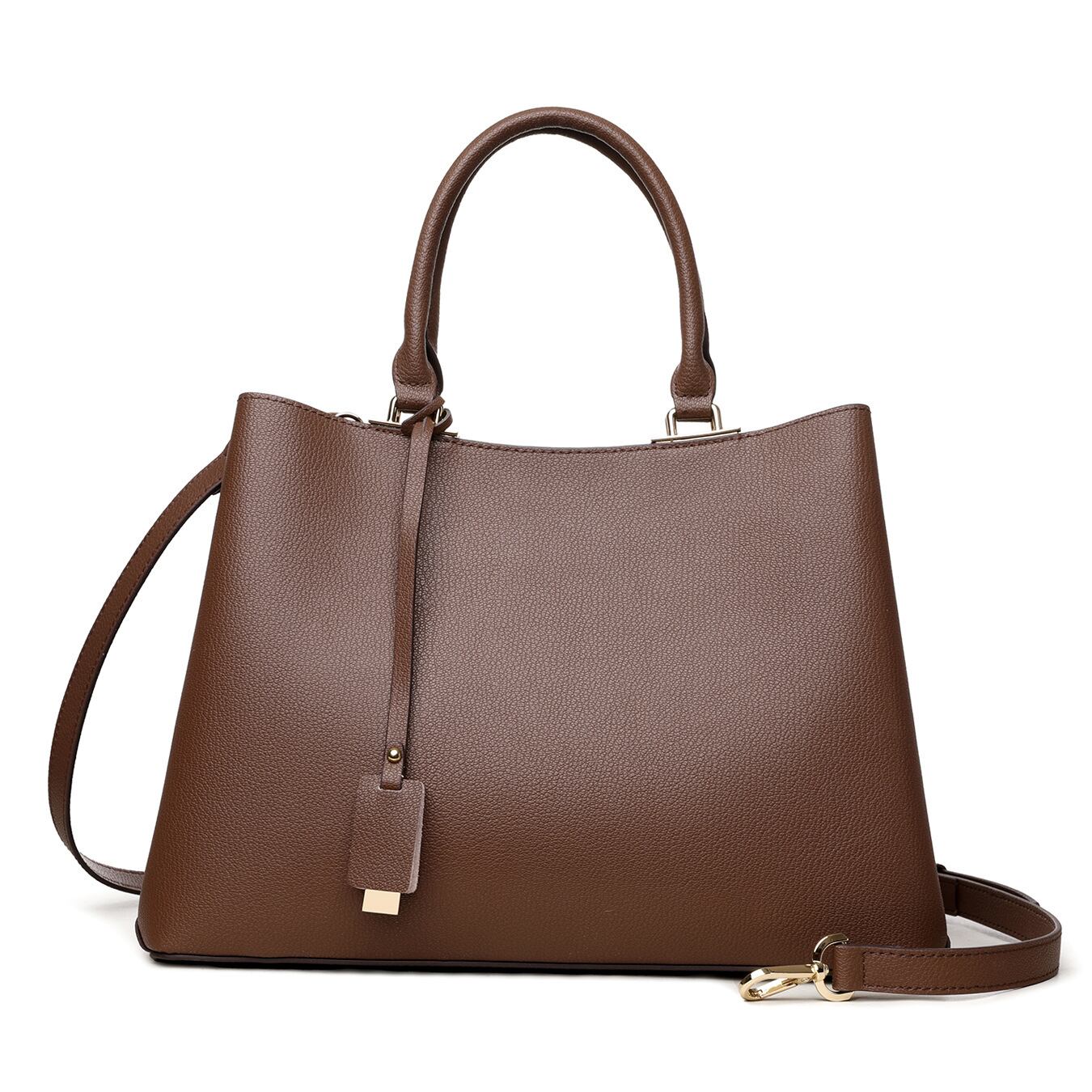トップハンドルと長さ調節が可能なロングショルダーストラップが付属しており、手提げ、ワンショルダー、斜め掛けなど、多様な持ち方に対応します。シンプルながらも存在感のある通勤用トートバッグです。