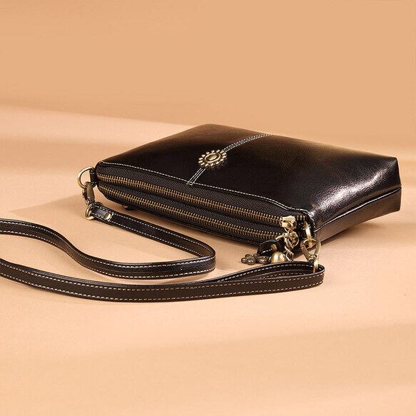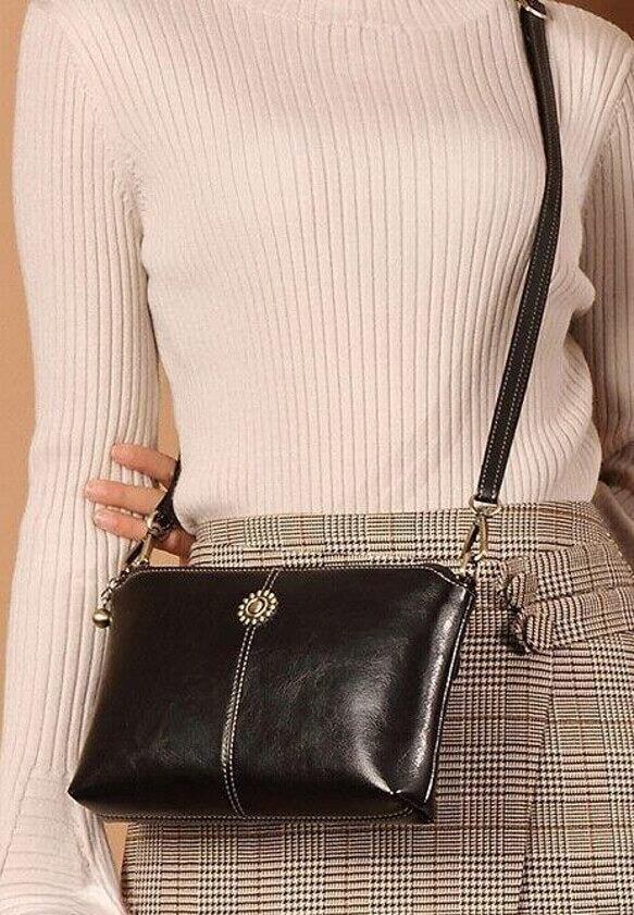 これは、レトロなスタイルを持つ植物鞣しの牛革製クロスボディバッグで、シンプルでエレガントなデザインが特徴です。
