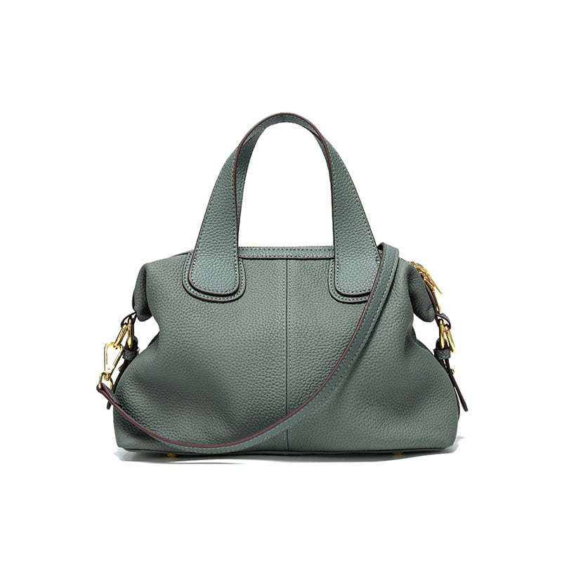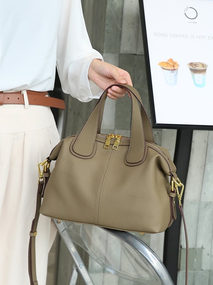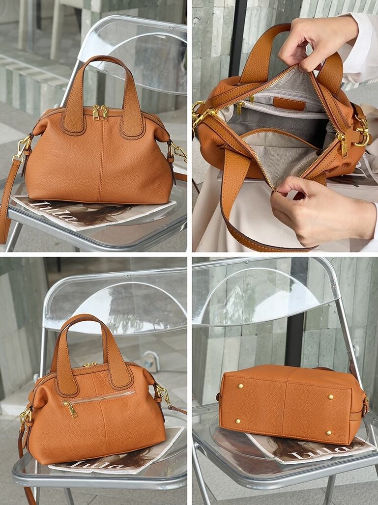 この天然牛革の手提げバッグは、柔らかさと深い質感で印象的です。