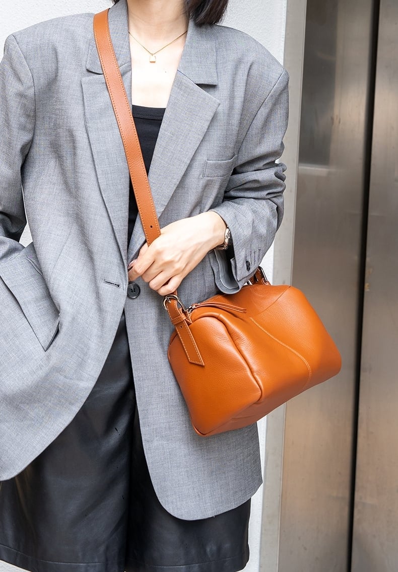 バッグ全体は厚みのある天然なやわらかい牛革を使用しており、素材は柔らかく、光沢と肌理感に富んでいます。経験豊富なレザー職人が手で一針一脚を丁寧にステッチしています。