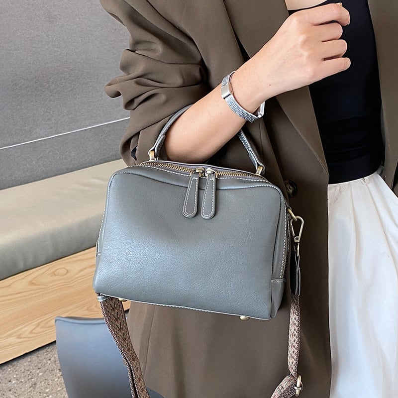 レザーのストラップは調整が可能で、取り外しも自由で、斜め掛けバッグからハンドバッグへのスタイルの変更が容易で、様々なシーンで使いやすいことを特徴としています。